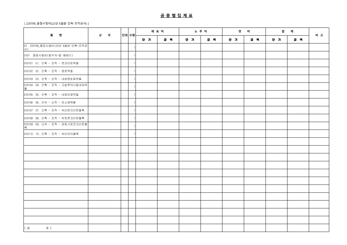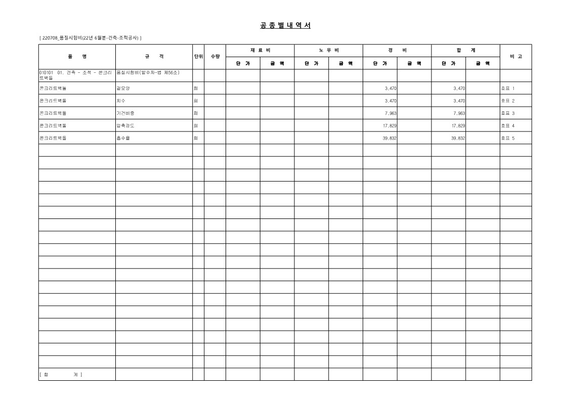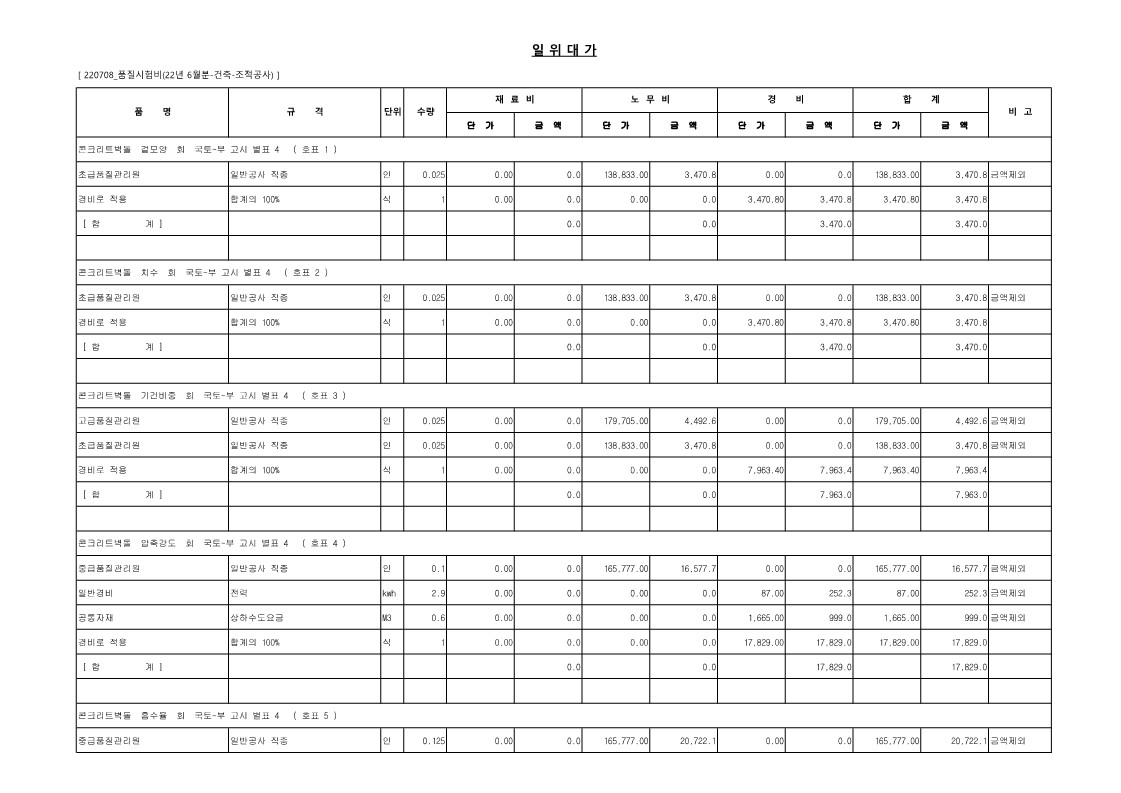 01. 22년 06월 품질시험비(발주자-법 제56조)_토공사, 기초공사, 철근콘크리트공사, 철강구조물공사 - [엑셀, 파일첨부] (5) | 2022.06.17 |