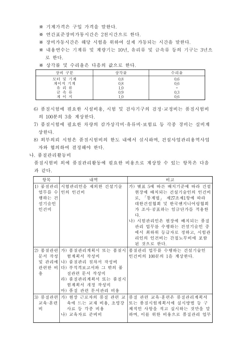 2) 품질시험인건비는 국토교통부장관이 고시하는인건비 산출단위량기준을 토대 로「통계법」 제27조제1항에따라 대한건설협회 및한국엔지니어링진흥협회가 조사·공표하는임금단가를적용하되, 시험관리인의 인건비는포함하지 않는다.